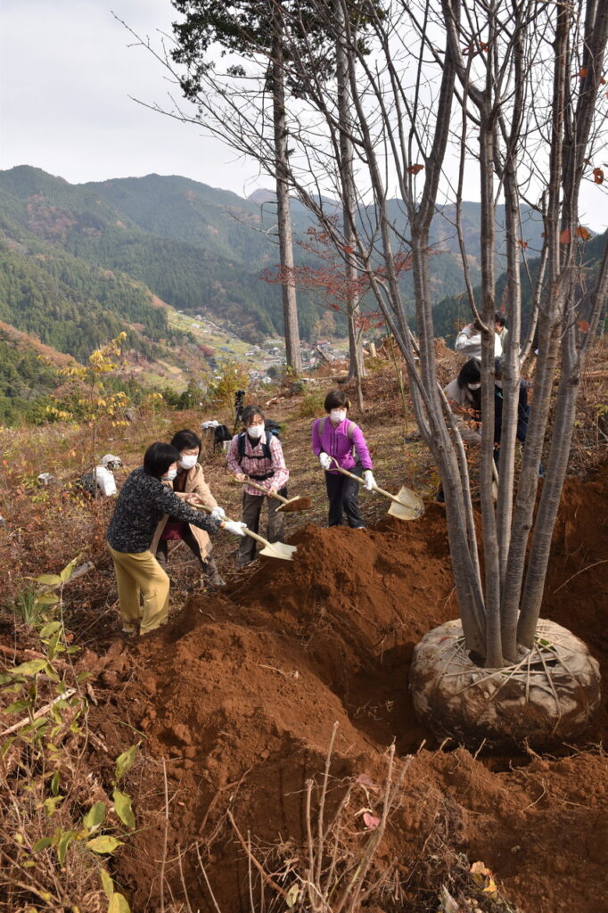 葬送の自由をすすめる会が所有する西多摩再生の森では今、杉、檜などの針葉樹から、モミジや桜などの広葉樹への植え替え作業を行っている。まだまだ数年はかかる大きなプロジェクトだが、社団法人人里(へんぼり)もみじの里の協力で山桜の植樹をすることになった。