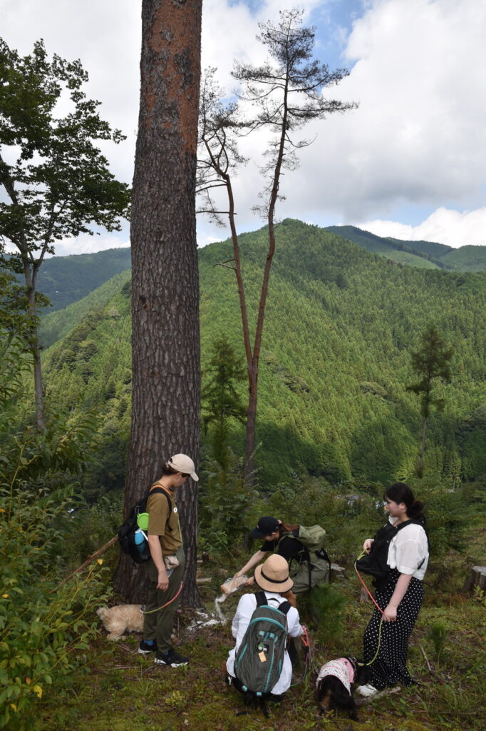 愛犬3匹も一緒に母堂のお別れを惜しみ赤松の周りに遺灰を撒いた。